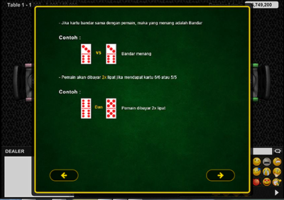 Jika nilai kartu pemain dan bandar adalah Seri / Draw, kartu bandar akan dianggap menang. Dengan kata lain, kartu pemain haruslah lebih tinggi (tidak sama) untuk dapat memenangkan permainan melawan bandar. - Jika total bulatan pada 2 kartu lebih dari 9, maka nilai kartu dikurangi 10.